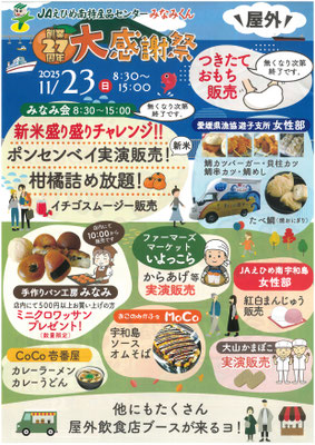 イベント情報 · 2025/11/17 JA特産品センターみなみくん大感謝祭 創業27周年✨JA特産品センターみなみくん大感謝祭💖を開催します。 2025年11月23日(日) 道の駅きさいや広場 屋外広場 8:30~15:00 1.宇和島みかん🍊地方発送! 8:30~販売開始 1,000個限定 10㎏箱 5,000円(税込) 2.ステージにてもちまき 10:00~ 3.ガラポン抽選会 他に、つきたておもち販売、みなみ会の🍚新米盛り盛りチャレンジ、パン工房みなみの🥐パン販売など 盛りたくさんの催しをご用意してお待ちしております。😆👋 tagPlaceholderカテゴリ: info