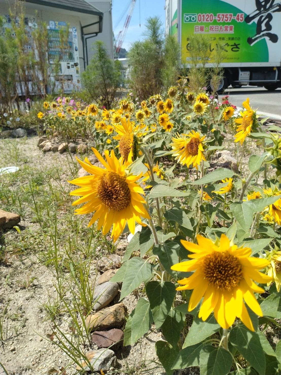 きさいや広場のパーク駐車場前のひまわりが可愛らしく咲いています。