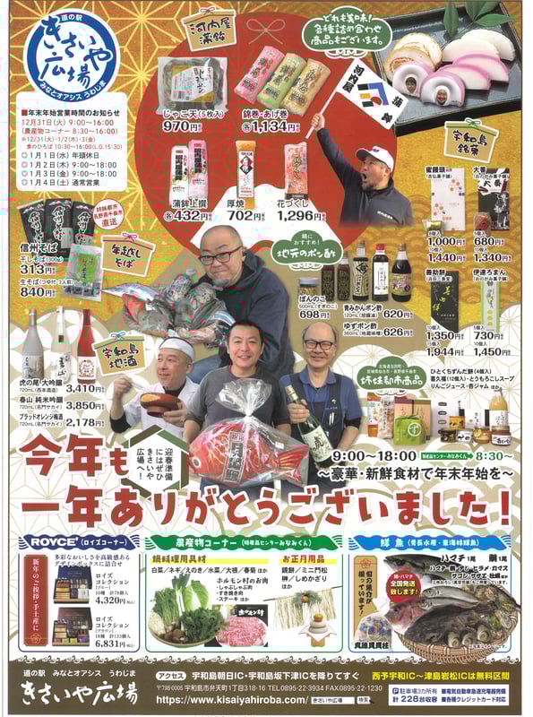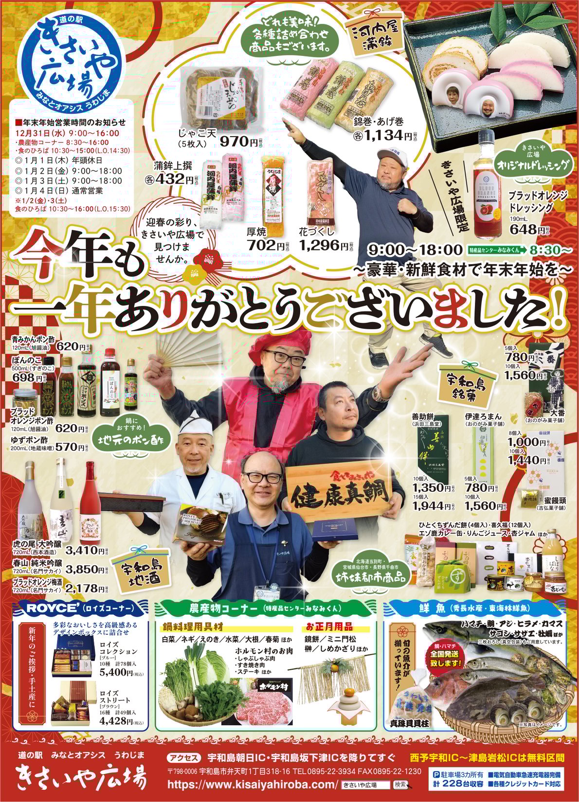 2025年も「道の駅 みなとオアシス うわじま きさいや広場」をご愛顧いただき、 誠にありがとうございました。 きさいや広場では、年末年始に必要なお正月用品、野菜、鮮魚、お土産🍱など盛りだくさんで 取り揃えております。 年末年始のお買い物は、ぜひきさいや広場で・・・ 皆様のお越しをお待ちしております。🎍🐴 【年末年始の営業】...